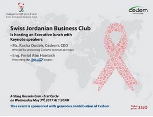 Opticancer Executive Lunch @ King Hussein Club On Wednesday, May 3 at 1:30 PM Swiss Jordanian business club & Cedem hosting an executive lunch with keynote speakers Ms. Rasha Oudeh , Cedem CEO who will speak about Cedem business activity …