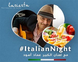 Italian Night with Emad Aswad @ La Siesta Restaurant and Cafe On Monday 8/5/2017 - 8:00pm till 11:00pm الاثنين ليلة البوفيه الايطالي في لا سيستا مع الفنان عماد اسود و فرقته الاجواء في لا سيستا ما بتحلى الا بوجودكم و …
