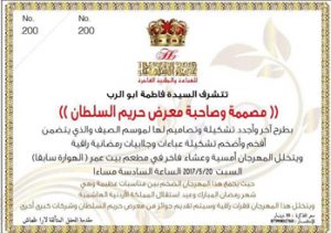 تتشرف السيدة فاطمة أبو الرب مصممة و صاحبة معرض حريم السلطان بطرح اخر و اجدد تشكيلة و تصاميم لها لموسم الصيف و الذي يتضمن أفخم و أضخم تشكيلة عباءات و جلابيات رمضانية راقية و يتخلل المهرجان امسية و عشاء فاخر …