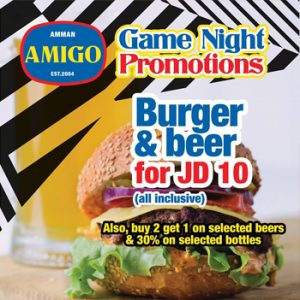 What a game night tonight is! Come and cheer! Lots of games on and don't forget to ask about our fantastic offers while you cheer your favorite team at Amigo!! Burger and beer for JD10 (all inclusive) Also buy 2 …