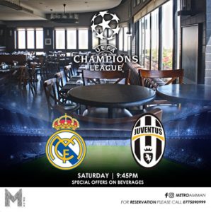 Join us Tonight at Metro Restaurant with a special Beverage offers for the UEFA Champions League Finals! Real Madrid C.F. VS Juventus with a kick of at 9:45PM! Reservations on 0775090999