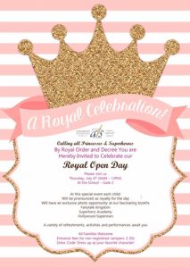 Calling all Princesses and Superheroes By Royal Order and Decree You are Hereby Invited to Celebrate our Royal Open Day Please join us Thursday July 6th (9AM-12PM) At the School-Gate 2 At this special event each child will be pronounced …