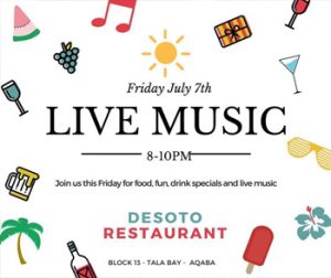 Friday July 7th LIVE MUSIC 8-10 PM Join us this Friday for food,fun,drink specials and live music DESOTO RESTAURANT Block 13- Tala Bay, Aqaba