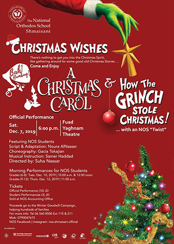 كونوا معنا في العرض المسرحي الموسيقي الممتع (باللغة الإنجليزيّة)، الذي يجمع اثنتين من أشهر قصص عيد الميلاد المجيد، دعمًا لعمل الخير. Join us for this wonderful musical play, combining two of the most popular Christmas classics, all for a good cause. "أمنيات ميلاديّة" Christmas Wishes العرض الرسمي تحت رعاية عضو الهيئة الإدارية - جمعية الثقافة والتعليم الأرثوذكسيّة الراعي الرسمي لمعونة الخير السنويّة 2019 السيّد إيليا جاد وكيلة الأكرم السبت ٧ كانون الأوّل ٢٠١٩ - ٦:٠٠ مساءً - مسرح فؤاد يغنم …