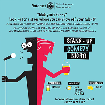 Do you think you're funny? Are you looking for a Stage to show of your talent? Rotaract Club of Amman-Cosmopolitan is giving you a chance to perform at our amateur Stand up night at Stortic Lounge on Tuesday the 15th of December. Ticket price is 10JD's including 1 drink All proceeds will be used to support the establishment of a sewing house that will benefit woman from local communities