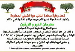 تحت رعاية سعادة النائب هيا الشبلي المحترمة يتشرف اتحاد المرأة / فرع الفحيص بدعوتكم للمشاركة في افتتاح مهرجان الخير و الزيتون - يفتتح المهرجان ابوابه يومي الجمعه والسبت 18/11/2016 و 19/11/2016 من الساعه 11 صباحا لغايه 7 مساء لدعم المشاريع …