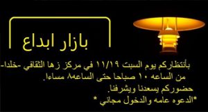 بازار ابداع بانتظاركم يوم السبت 19/11 في مركز زها الثقافي - خلدا من الساعة 10 صباحاً حتى الساعة 8 مساءً حضوركم يسعدنا و يشرفنا الدعوة عامة و الدخول مجاني