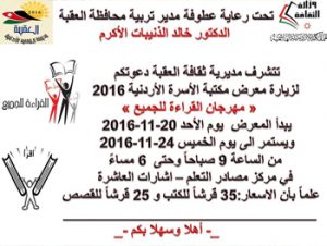 تحت رعاية عطوفة مدير تربية محافظة العقبة الدكتور خالد الذنيبات الأكرم تتشرف مديرية ثقافة العقبة دعوتكم لزيارة معرض مكتبة الأسرة الأردنية 2016 مهرجان القراءة للجميع يبدأ المعرض يوم الأحد 20/11/2016 و يستمر الى يوم الخميس 24/11/2016 من 9صباحا حتى 6 …