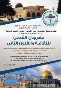 تحت رعاية عطوفة نقيب الأطباء الدكتور علي العبوس تتشرف لجنة أطباء من أجل القدس / نقابة الأطباء الأردنية بدعوتكم لحضور فعاليات مهرجان القدس للثقافة و الفنون الثاني و الذي يتضمن محاضرة تذكارية للدكتور زغلول النجار الساعة 10:45 و كذلك بازار …