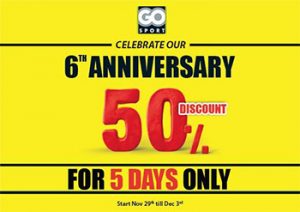 6th Anniversary Sale @ Go Sport Jordan November 28 – December 3, 2016 50% off on EVERYTHING for 5 days starting from today in the celebration of our 6th Anniversary at Go Sport Mecca mall, Taj mall, Galleria mall and …