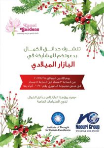 تتشرف حدائق الكمال بدعوتكم لحضور البازار الميلادي يوم الإثنين الموافق 28/11/2016 من الساعة 3 مساءا" و حتى الساعة 8 مساءا يعود رسوم استئجار الطاولة في البازار لمنفعة طلاب حدائق الكمال