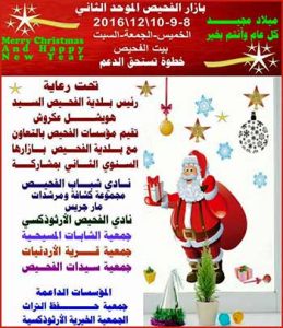 Fuheis Bazaar @ Beit Al-Fuheis On December 8th, 9th & 10th, 2016 - daily until 10:00pm تحت رعاية رئيس بلدية الفحيص السيد هويشل العكروش تقيم مؤسسات الفحيص بالتعاون مع بلدية الفحيص وبمشاركة نادي شباب الفحيص ومجموعة كشافة ومرشدات مار جريس …