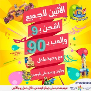 اشحن ب 9 دنانير والعب ب 90 دينار + وجبة طفل + بالون + رسم على الوجه في جالكسي بارك اربد سيتي سنتر