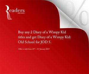 "Diary of a Wimpy Kid" Offer @ Readers Bookshop Valid till January 31st, 2017 Buy any 2 Diary of a Wimpy Kid titles and get Diary of a Wimpy Kid: Old School for 5JD And again we're introducing a new …