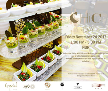 It’s time for Chic Friday at Fairmont Amman! Join us on Friday 24 November 2017 and savor world class dishes from our very own venues as well as a day full of fun and activities for the kids! For bookings and for further information please call us at 065106000 or visit us at http://www.fairmont.com/amman/dining/fairmont-chic-fridays/