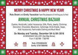 MERRY CHRISTMAS & HAPPY NEW YEAR! Rola Shukri and Gretty Yacoubian have the pleasure of inviting you to their Annual Christmas Bazaar @ Broadway Gallery On Monday and Tuesday December 5th & 6th 2016 from 11AM to 7PM Cookies, Handicraits, Ladies‘ Accessories, Gifts, Plants, Jewelry, Christmas Decoration, Chocolates, Macaroons, Cartonnage, Knick-Knacks, Soaps, Kids’ Accessories, Fashionable Clothing and Much More! On Monday and Tuesday, December 5th & 6th 2016 At BROADWAY GALLERY (See Map Below) From 11:00 AM - 7:00 PM …