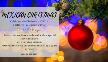 Why not celebrate the festive season in a different and unique way? Join us at Cinco De Mayo restaurant during Christmas EVE in a festive atmosphere combined with a special Mexican menu complete with carving stations. (Beef fillet with mole sauce, Turkey and Burritos) at JD36.00 inclusive per person including a glass of wine.