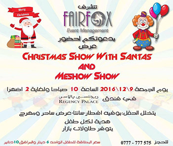 حفلة الاطفال السنة غير شكل تعو احتفلوا معنا في فندق الريجنسي بالاس يوم 9/12/2016 عال 10 الصبح عرض الساحر ميشو لا وكمان عرض سانتا وهدية لكل طفل وكمان اشهى اكل