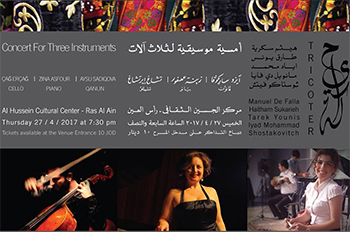 Ateek Initiative presents a concert for hhree Instruments entitled Tricoter / Hiyakeh with Turkish cellist Cag Ercag, qanun Player from Atherbeijan Ayzu Sadiqova and pianist Zina Asfour. The programme includes works by Iyad Mohammad Tarek Younis, Haitham Sukkarieh, De Falla, and Shostakovitch arranged by Iyad Mohammad.