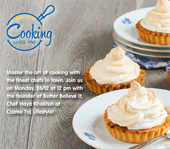 Are you ready for our final cooking session at Cozmo Taj Lifestyle? Join us to learn the art of cooking with the founder of Butter Believe it, chef Haya Khalifeh! Space is limited, reserve your spot by calling us on 065927820