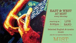 East and West @ MIST Mondays - at 8 PM - 11:30 PM Join us for our special "Mondays at MIST" event, where we will be featuring a live band singing diverse English and Arabic music, starting at 8:00pm. Enjoy sharing with your friends our international mezzeh-style menu served to accompany Arak and your other favorite drinks. Our distinctive mezzeh menu is only available on Mondays! For more info or reservation call us at 0797776769