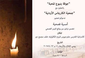 تحت رعاية صاحب السمو الملكي الأمير الحسن بن طلال -حفظه الله- تتشرف جوقة ينبوع المحبة، بالتعاون مع “جمعية كاريتاس الأردنية”، بدعوتكم لحضور أمسية فصحية تتضمن تراتيل من روائع الزمن الفصحي، وذلك في كتدرائية القديس جاورجيوس للروم الكاثوليك – خلف مجمع جبر، يومي الثلاثاء والأربعاء 11 و 12/ 4/ 2017 في الساعة 8:00 مساءً