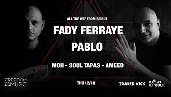 Bringing two talents from Beirut straight to Amman this Thursday night! First is FADY FERRAYE, who needs absolutely no introduction at all, along his favourite partner and afterparty guru PABLO live at Trader Vic’s – Regency Palace ..