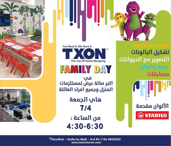زورونا يوم الجمعه وعيشو متعة التسوق في Txon مع خصومات من 20% ولغاية 50% بالاضافة الى فعاليات يوم العائلة لأطفالكم والتي يتخللها الرسم والتلوين وFace painting و Balloon shaping والرقص واللعب مع المهرجين.