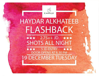 Tuesday!! It’s Flashback night at Camelot! featuring Dj Haydar Alkhateeb! Let’s dance and enjoy the best music with shots 2.75++ JD! Doors open at 8.30 Pm, let’s have a night to remember