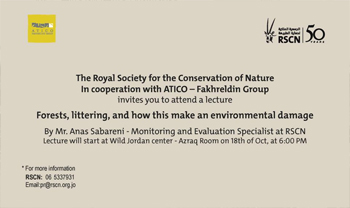 الجمعية الملكية لحماية الطبيعة بالتعاون مع مجموعة اتيكو – فخرالدين تدعوتكم للمشاركة في محاضرة بعنوان “الغابات وإلقاء النفايات وضررها البيئي” يلقيها السيد انس صباريني أخصائي مراقبة وتقييم في الجمعية وذلك في تمام الساعة 6 مساء من يوم الثلاثاء الموافق 2016/10/18 في مركز برية الاردن – قاعة الأزرق
