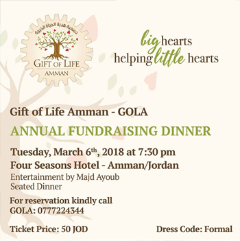 Come and join us at our Annual Fundraising Dinner on Tuesday, March 6th at the Four Seasons Hotel, to help save the lives of many more kids with congenital heart disease in Jordan!