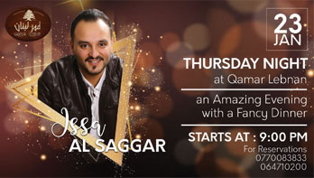 يــــوم الخـــميـــس سهـــرة استــــثنائـــية مــع النـــجم الرائـــع عيــــسى السقـــار فــي مطـــعم قمــر لبـــنان اهـــلا وسهـــلا فيـــكم جميـــعاً للــحجــز والاســتفــســار 0770083833 064710200