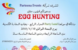 تتشرف شركة Parteena Events بدعوتكم لحضور حفل Egg Hunting في موقعنا Party Land الدوار الرابع - بجانب السفارة الكندية يوم الجمعة الموافق 19-4-2019 من الساعة الرابعة وحتى الساعة السادسة مساء سعر التذكرة 6 دنانير سعر تذكرة المرافق 1 دينار للحجز والاستفسار يرجى الاتصال على الرقم 0798350251
