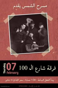 حفل موسيقي لفرقة شارع ال 100 , و هي فرقة تقدم الأغاني الطربية القديمة و الحديثة و دمج ما بينهم بطريقة رائعة . و سيكون ذلك يوم الخميس الساعة 7:30 مساءا سعر التذكرة : 3 دنانير تباع التذاكر في مسرح الشمس