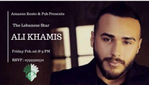 For the first time in Amman .. The Lebanese Star .. ALI KHAMIS @ Amazon Resto & Pub Join us .. And enjoy the outstanding performance of the amazing Star Ali Khamis .. and dance all the night long with the best Arabic & English hits with our resident DJ .. Big Daddy Friday, Feb.1st @ 9:00 PM Entrance on the door : 10 JDs For reservation or Info please call us : 0799320370