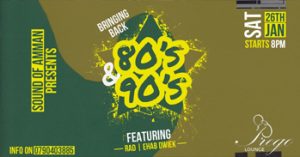 Sound of Amman bringing back the 80's & 90's! Lets rewind to the past with DJ's + RAD + EHAB DWIEK •Event location: Prego Lounge •Date: Saturday, January 26th •Doors open at 8:00 PM •Entrance: 10 JOD at the door •For Table bookings call: 0790403885 | 0795851815 .