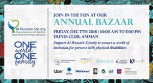 Join us at Al Hussein Society's Annual Bazaar, a family friendly event filled with shopping, delicious food, choirs, dance and activities for all! There will be a 50% discount on Uber rides to and from Dunes Club! PROMOCODE: AHSbazzar Hosted by Al Hussein Society Jordan Center for Training & Inclusion in Cooperation, with the Diplomatic Corps and International Ladies Clubs