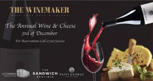 Christmas Season is around the corner The Winemaker in collaboration with The Sandwich Boutique & Saint George Wines invites you to attend their Annual Wine & Cheese Night on Monday 3rd of December 2018 Tickets Sell out quickly so be sure to buy your ticket by calling 0796796000
