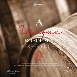 A unique Bordeaux experience awaits at Salt Steakhouse on Tuesday December 4 2018! Join us for an impeccable dining experience featuring a four-course menu prepared by Chef Husam and the amazing team behind Salt Steakhouse as well as wine-pairing experience by Maison Sichel Wines. JOD 45++ per person Don't miss out! Book your table today by calling 065106000 or email dining.amman@fairmont.com **Limited seats available