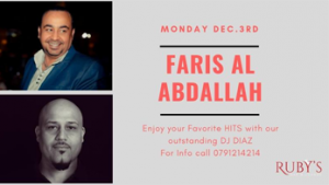 Join us at Ruby's and enjoy our live show for the great star Faris Al Abdallah & the superior DJ DIAZ on Monday Dec.3rd. Enjoy the beautiful view of Amman while listening to this legendary voice & your favorite Arabic & English hits. For more details and bookings, call us at 07 9121 4214