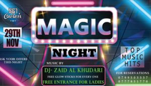 Bring your friends and dancing partners and come along! This Thursday 29th Nov. Where fun will reach maximum odds, Come with the gang and get Magic Night with the best all time hits. ♪ Music by | DJ- Zaid Al Khudari ►Free Entrance for ladies all night ✔ Free glow sticks for everyone. ►Doors open at 9:30 PM. ►Entrance Fee: 10 JOD Including 1 drink. ►Couples and Mixed groups policy applies. ✔ Free glow sticks for everyone. ---------------------------------------- Enjoy a …