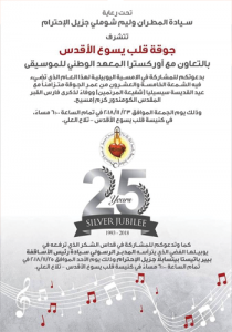 تحت رعاية سيادة المطران وليم شوملي جزيل الاحترام تتشرف جوقة قلب يسوع الأقدس بالتعاون مع أوركسترا المعهد الوطني للموسيقى بدعوتكم للمشاركة في الأمسية اليوبيلية لهذا العام التي تضيء فيه الشمعة الخامسة و العشرون من عمر الجوقة متزامنا مع عيد القديسة سيسيليا (شفيعة المرنمين) و وفاء لذكرى فارس القبر المقدس الكومندور كرم امسيح و ذلك يوم الجمعة الموافق 23\11\2018 في تمام الساعة السادسة مساء في كنيسة قلب يسوع الأقدس - تلاع العلي. يرجى الحضور قبل الموعد بنصف ساعة. كما و تدعوكم …