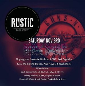 Saturday November 3rd Rock Night at Rustic! Blasting hits that can't be missed! Favorite bands playing: Led Zeppelin, ACDC, Rolling Stones, Kiss and many more... Offers for the night include: Jack Daniels Bottle 40 JDs++ By glass 3 JD's ++ Honey Bottle 45 JDs++ By glass 4 JDs++ Fire shot 3 JDs++ Cocktails for 4JDs++ Sponsered by @jackdaniels_us Reserve now 0797060405