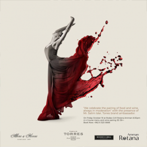 “We celebrate the pairing of food and wine, always in moderation” with the presence of Mr. Salim Isler, Torres brand ambassador. On Friday October 19 at Rodeo Grill Rotana Amman 8:30pm A 4 Course menu and wine pairing JD 39++ Book Now: +962 6 520 8888