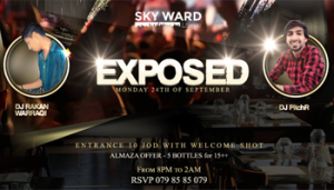 Exposed @ SkyWard Lounge Monday 24th of September Featuring DJ Rakan Warraqi & DJ PitchR Couples & Mixed Groups only Entrance 10 JOD with Welcome Shot Special Offer on ALMAZA Beer 5 Bottles for only 15++ From 8PM to 2PM RSVP 079 85 85 079