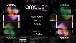 Ambush, a cult specialised in throwing concrete shaking grooves and quality events. Showcasing top-notch artists from around the world. Join our first Ambush event featuring Jazar Crew who will be taking you through a mind bending experience. Jazar Crew is a DIY music and art collective that aims to provide a safe space dancefloor for the Palestinian youth. With their revolutionary parties around the region, they built bridges between the Palestinian underground scenes in Haifa, Ramallah and beyond. Lineup: Jazar …