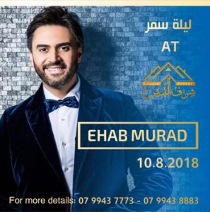 ليلة سمر الجمعة ١٠/٨/٢٠١٨ في القاعة الخارجية لمطعم شرف الدين مع الفنان ايهاب مراد واجمل اجواء الصيف يشمل الحفل بوفيه عشاء مفتوح (زرب ، مشاوي ، خاروف محشي ، سمك ، باستا ستيشن ) مع بوفيه مقبلات متنوع السعر للشخص ٢٥ دينار 07 9943 7773 - 07 9943 8883 **الحجز المسبق الزامي