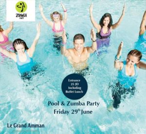 POOL PARTY (MIX) Le Grand Amman Managed By AccorHotels Friday 29/6 10:30am -7:40pm 25Jd with open buffet Kids 12.50 Jd DJ Wassim Saffouri Zumba®️with Huda B Huda Maryana Shnoudi Zin Aqua Zumb®️,Zumba kids®️ with Huda B Huda Yoga with Katia Ekhina Tickets are available OJ's 0777431651