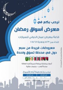 رمضان مبارك، نستقبلكم في معرض أسواق رمضان اعتبارا من يوم الأربعاء ٥/٢٣ في قاعه معرض عمان الدولي للسيارات ، محطه تسوق واحده من منتجات سبع دول ، اهلًا وسهلا