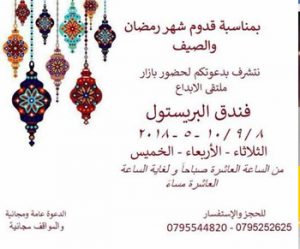 يقام بازار ملتقى الإبداع ككل عام بفندق البريستول ايام 8/9/10-5 بمناسبة شهر رمضان و قدوم الصيف أفضل البضائع ر المنتجات التي لا تجدونها في السوق المحلي